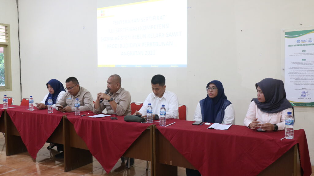 Bertempat di R-12 Institut Teknologi sawit Indonesia, Rektor ITSI Purjianto, S.E., M.M. melakukan penyerahan Sertifikat Kompetensi Skema Asisten Kebun Kelapa Sawit kepada mahasiswa Program Studi Budidaya Perkebunan Angkatan 2020 yang digelar bekerja sama dengan Balai Pelatihan Pertanian (BPP) Jambi pada tanggal 29-30 April 2024 yg lalu.